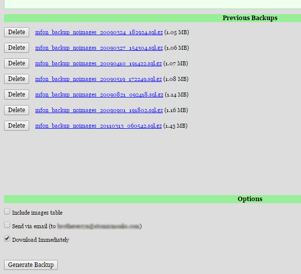 Backups were generated by a nightly job, but could also be generated manually. They were small enough (when excluding images) that they were trivial to send via email.