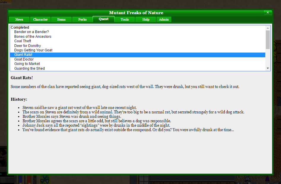 Atomic Monks Home Tech Games Blog Pretty standard quest log, with history and the ability to review completed quests. Quest log PreviousNext