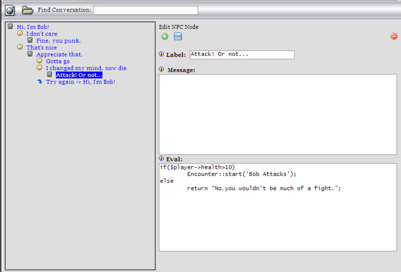Conversation trees were stored as XML and could interface with the game's API. You could do almost anything within a conversation node.